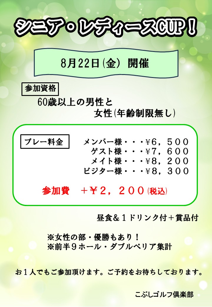 シニア・レディースCUP 2023年3月30日 カレンダー カレンダーに追加 Timely カレンダーに追加 Google に追加 Outlook に追加 Apple カレンダーに追加 他のカレンダーに追加 XML ファイルとしてエクスポート 日時: 2025年8月22日 終日 2025-08-22T00:00:00+09:00 2025-08-23T00:00:00+09:00 シニア・レディスCUP! 男性60歳以上と女性限定 【9H・WP集計】 ☆昼&1D付☆