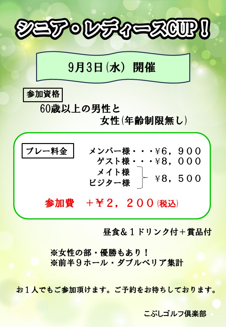 シニア・レディースCUP 2023年3月30日 カレンダー カレンダーに追加 Timely カレンダーに追加 Google に追加 Outlook に追加 Apple カレンダーに追加 他のカレンダーに追加 XML ファイルとしてエクスポート 日時: 2025年9月3日 終日 2025-09-03T00:00:00+09:00 2025-09-04T00:00:00+09:00 シニア・レディスCUP! 男性60歳以上と女性限定 【9H・WP集計】 ☆昼&1D付☆