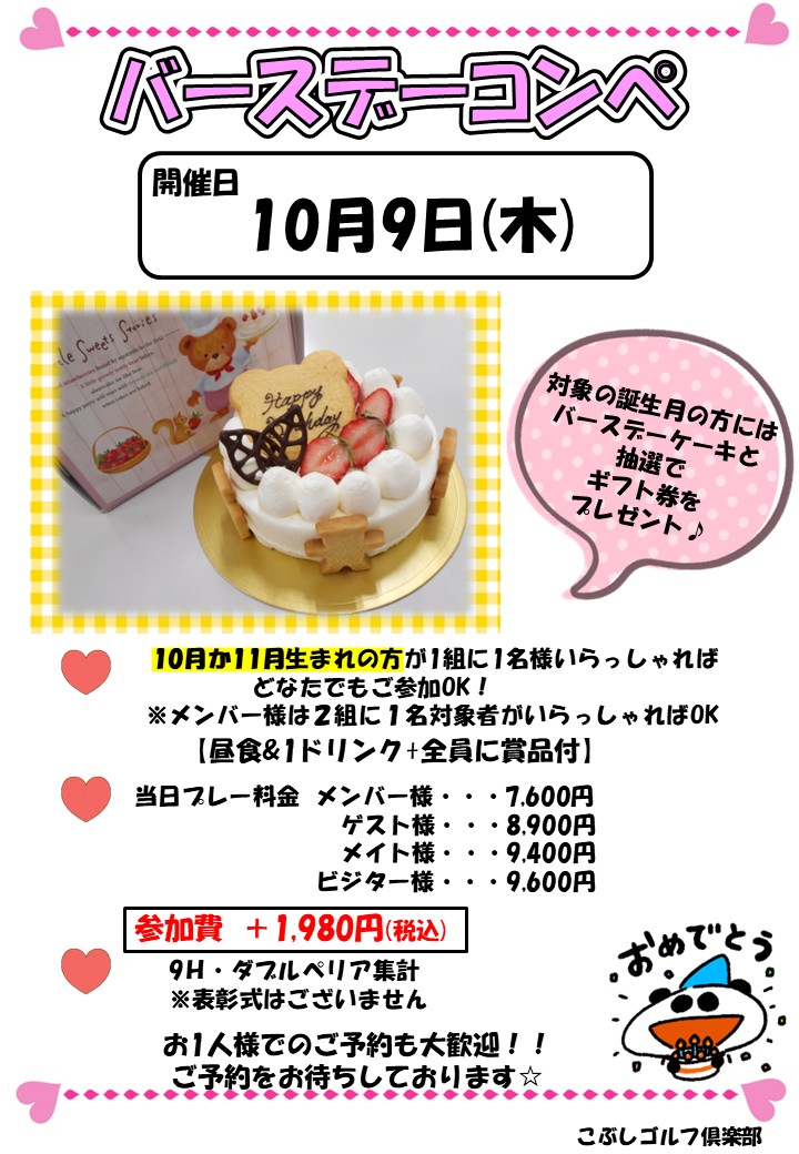 バースデーコンペ(10・11月) 2023年2月11日 カレンダー カレンダーに追加 Timely カレンダーに追加 Google に追加 Outlook に追加 Apple カレンダーに追加 他のカレンダーに追加 XML ファイルとしてエクスポート 日時: 2025年10月9日 終日 2025-10-09T00:00:00+09:00 2025-10-10T00:00:00+09:00 バースデーコンペ 10月か11月生まれの方が1組に1名以上 【9H・WP集計】 ☆昼&1D付☆