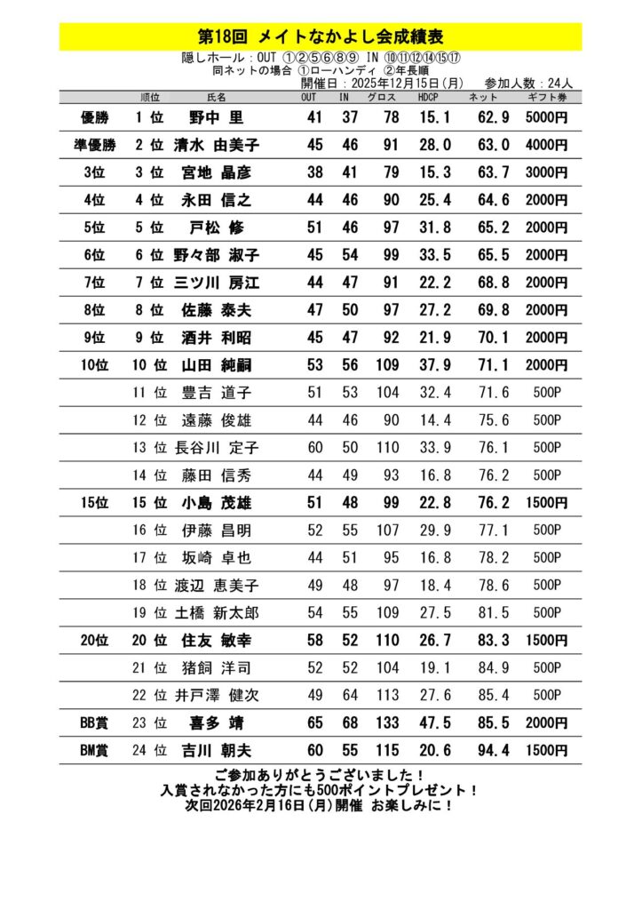 第18回メイトなかよし会結果発表 2025年12月15日 本日もメイトなかよし会にご参加頂きまして誠にありがとうございます! 24名様ご参加の成績表を掲載いたします(下記をクリックでPDF成績表が開きます) (1000ポイント単位=1000円としてプレー代より値引き可能) 次回は2026年2/16(月)開催! ビジター様はメイト入会無料!たくさんのご参加お待ちしております♪