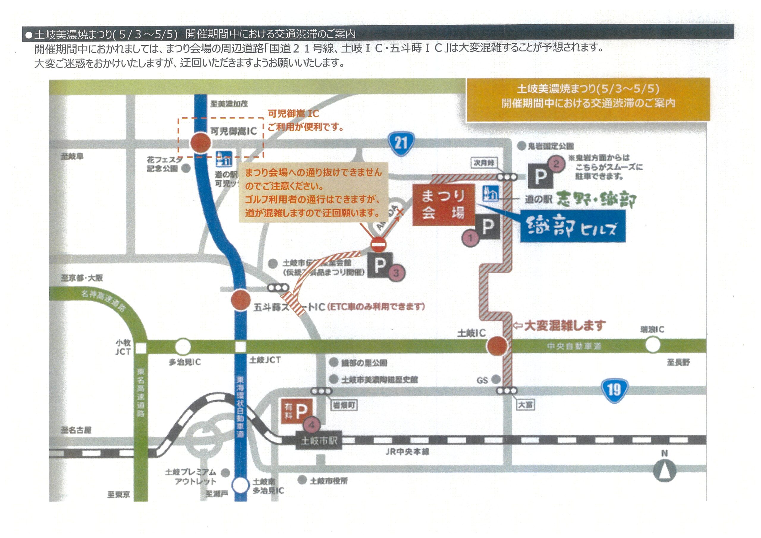 中央道「土岐IC」、東海環状自動車道「五斗蒔IC」は大変混雑いたします。