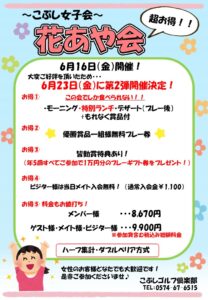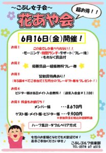 第2・第4火曜日をレディースDAYとし、女性のお客様とご同伴者様を 昼食&1ドリンク付きの優待料金でお迎えいたします♪ (休場日・祝日を除く) 一組に1名女性がいらっしゃれば、男性のお客様もお得に! コンペのお客様は女性の人数×組数のお客様がお得に!! 女性の方はうれしいちょこっとプレゼント♪などさらに特典付!! ビジターの女性の方はメイト入会金(1,100円)が無料! ぜひご来場をお待ち申し上げます!! ※直接お電話でのご予約・当社HPレディースDAYプランからのご予約の方限定料金&特典です。 HPからのご予約はこちらから↓↓ https://pp-web2.jp/calendars/kobushi/calendar 他サイトのレディースDAYプランは料金やサービスが異なりますので予めご了承下さい。